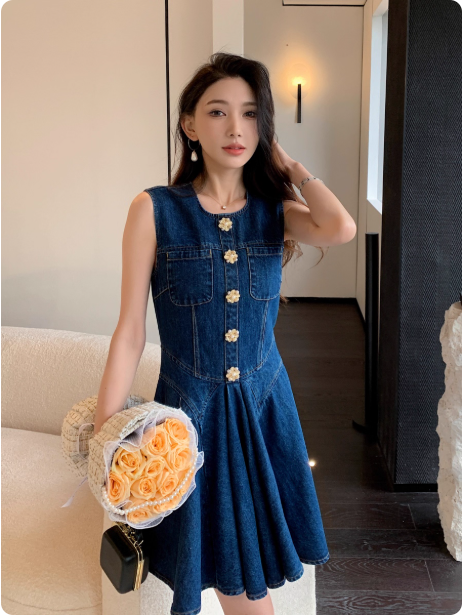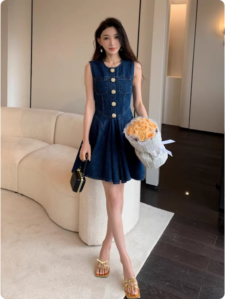明星同款无袖背心牛仔裙时尚气质收腰超好看连衣裙