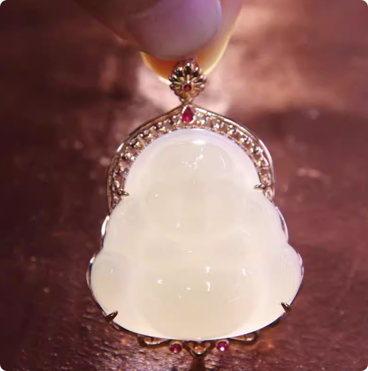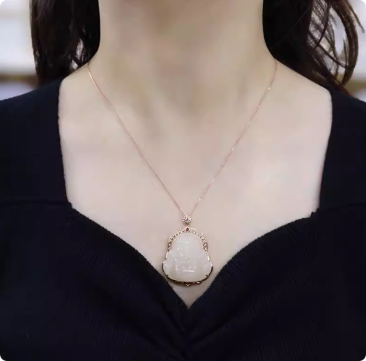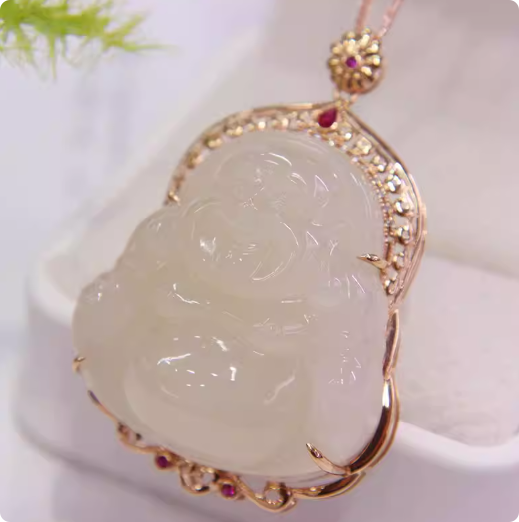 藕粉白玉笑佛镶18k金吊坠30mm